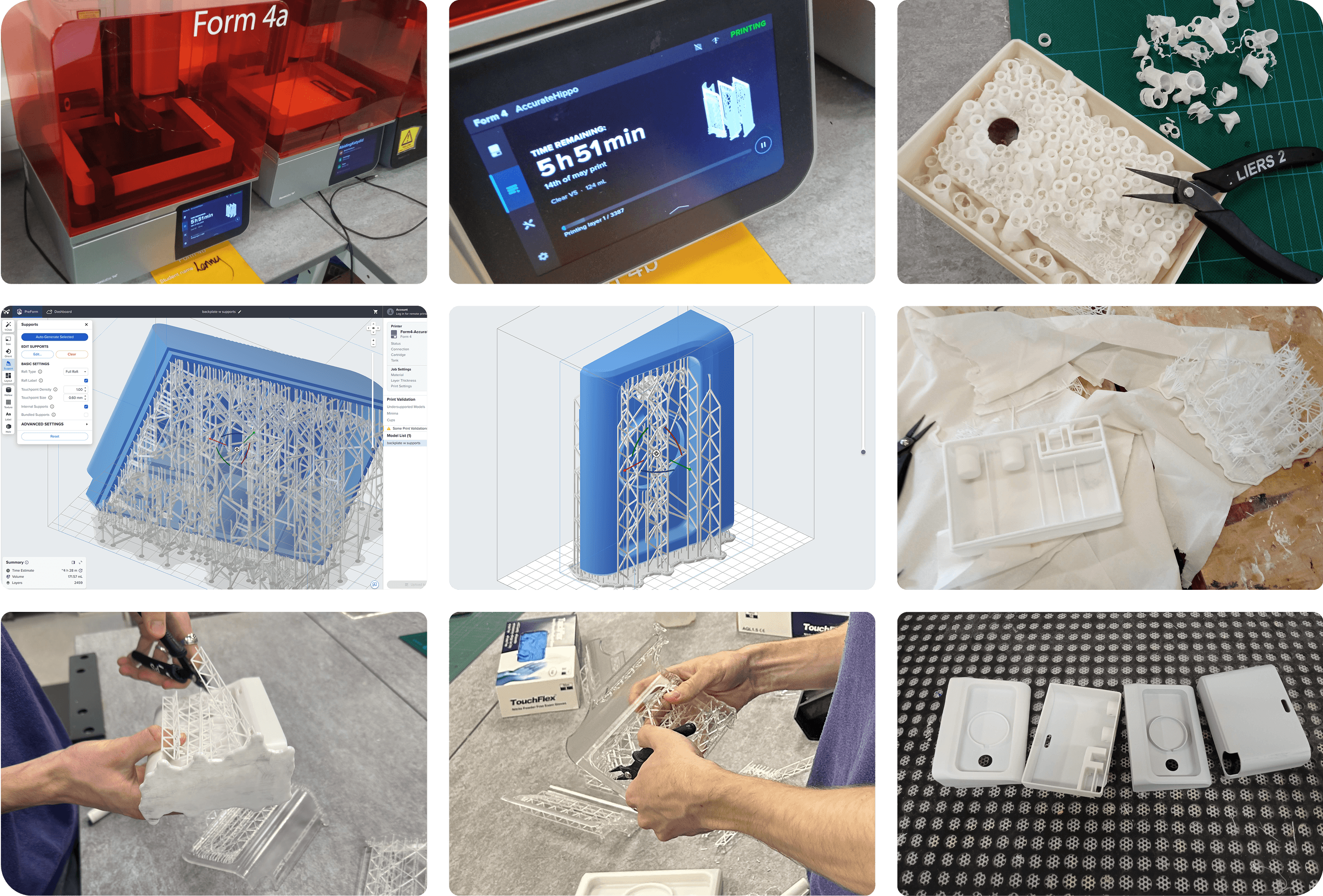 After I finally finished CAD modelling I was ready to start 3D printing. Hannah the technician in the 3D workshop was kind enough to explain how to use the slicer software to generate supports for my parts and helped me throughout the two month process immensely to reach the desired precision and quality for the final prototype.