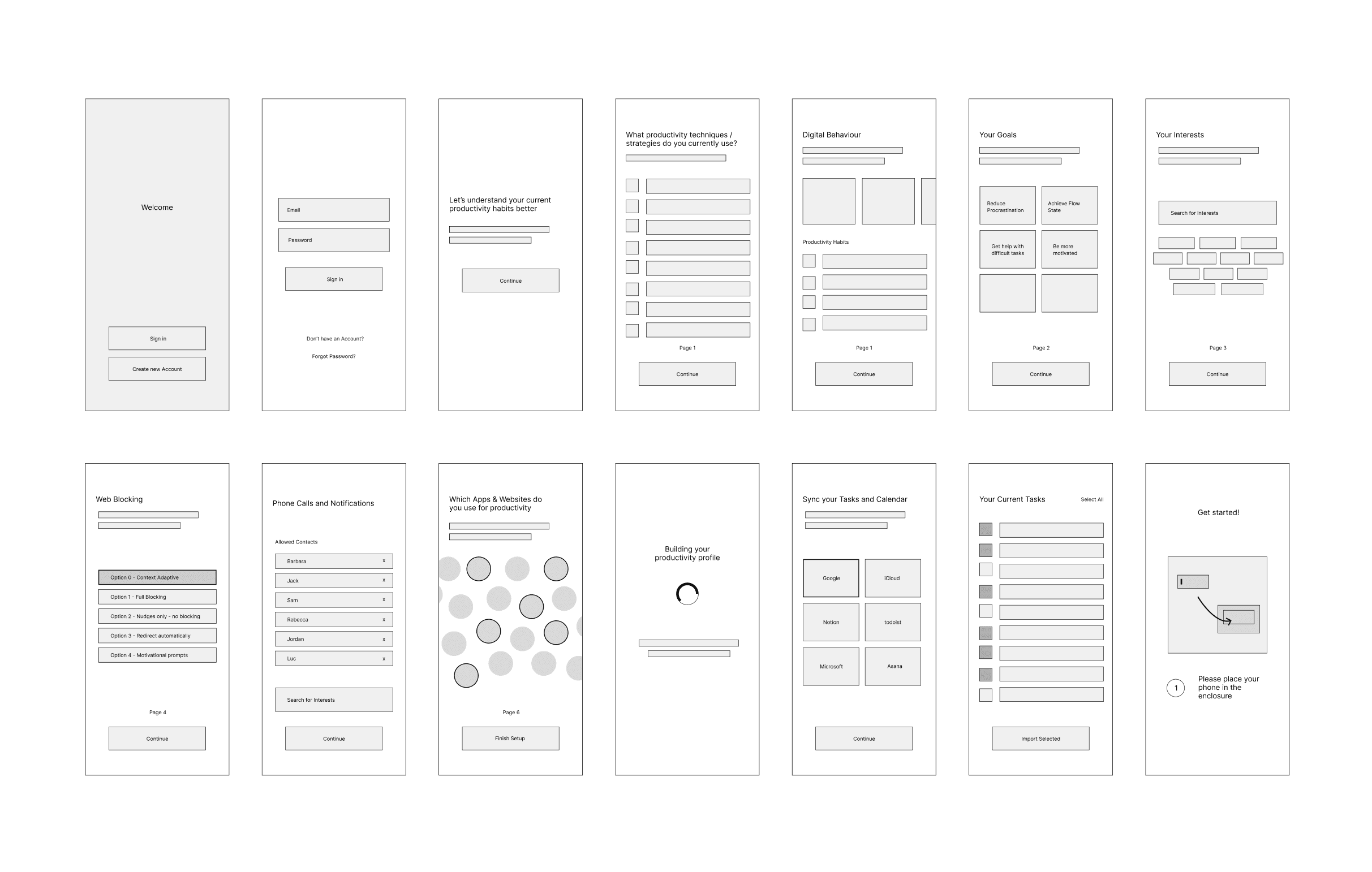 I created a set of wireframes for the digital app alongside the physical product to help me ideate and prototype in order to understand the different user flows better and which features to prioritise. I went through many iterations to structure the core functionality intuitively.